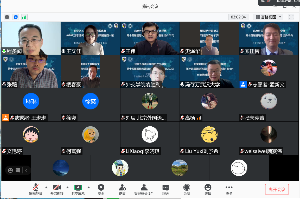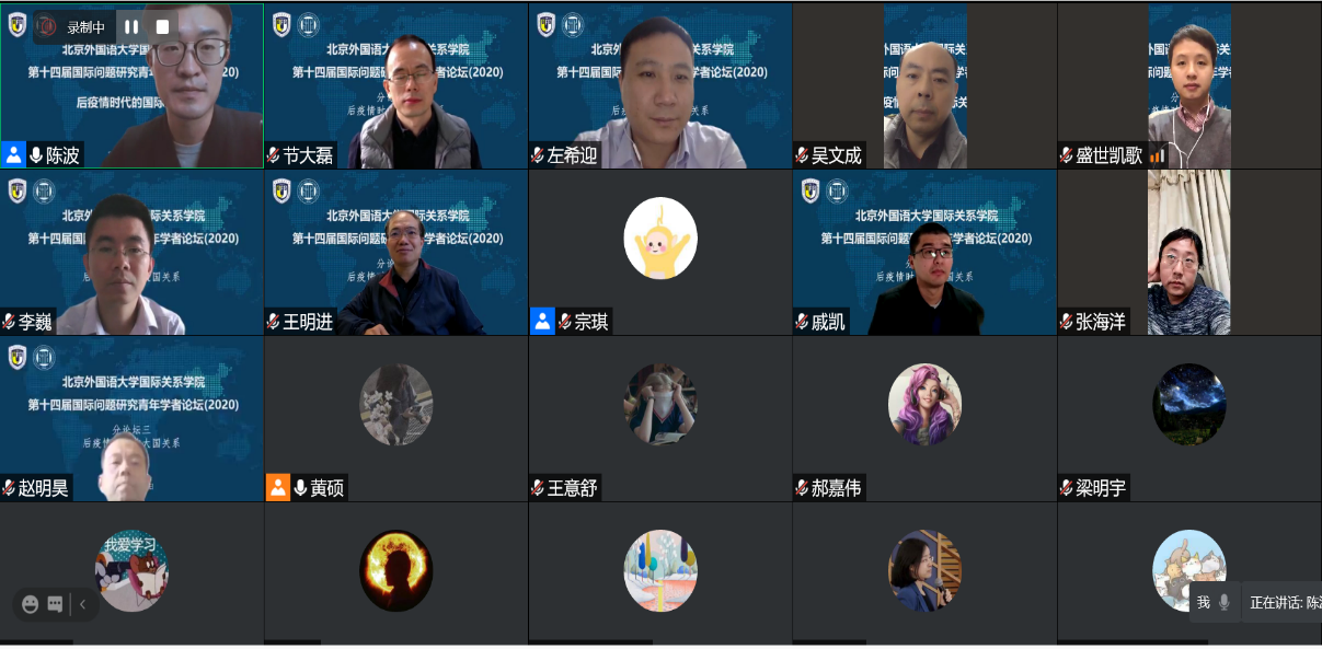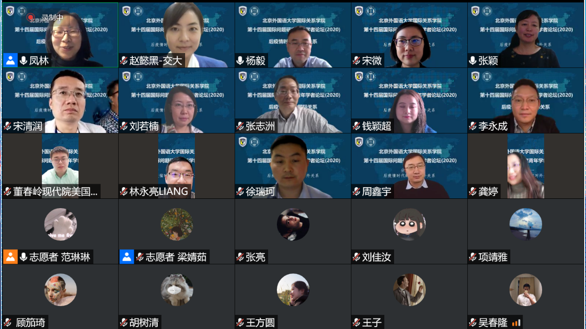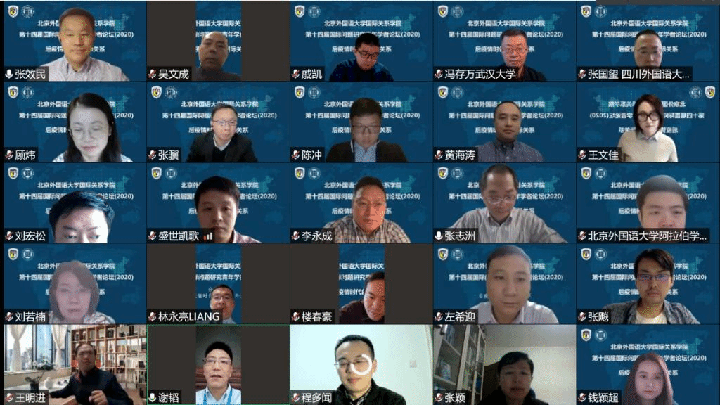 2020年11月21日,pp电子模拟器官网成功举办第十四届国际问题研究青年学者论坛。论坛主题为“后疫情时代的国际关系”,以线上形式举行,与会学者50多人,来自北京大学、清华大学、中国人民大学、复旦大学、上海交通大学、南开大学、武汉大学、中央民族大学、中国政法大学、对外经贸大学、外交学院、pp电子模拟器官网、四川外国语大学、北京外国语大学等高校,中国社会科学院、中国现代国际关系研究院、中国国际问题研究院、中联部当代世界研究中心、商务部国际贸易经济合作研究院、上海社会科学院、上海全球安全治理研究院等研究机构。pp电子模拟器官网党总支张效民书记主持开幕式,谢韬院长致欢迎辞。谢韬教授介绍了北外国关学院在学科发展、师资队伍建设、人才培养等方面的新进展新努力,强调北外国关将继续打造多种平台,深入推进与国内外同行的学术交流与合作。