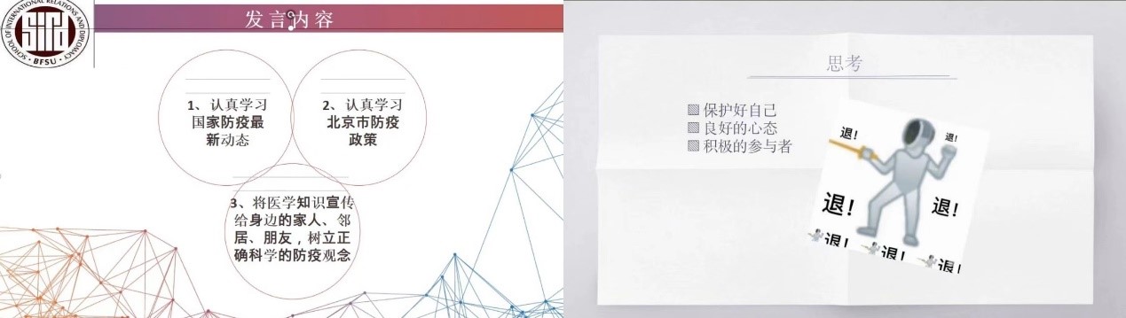 当前,北京疫情防控正处于攻坚阶段,不容丝毫迟疑和松劲懈怠。为充分发挥党支部战斗堡垒和党员先锋模范作用,增强青年学生抗疫责任感与使命感,提高党组织凝聚力和战斗力,202252719时,pp电子模拟器官网研究生第一党支部开展“党旗飘扬,抗疫有我”主题党日活动,全体支部党员、发展对象、入党积极分子参与本次活动,共同学习贯彻习近平总书记关于新冠肺炎疫情防控重要讲话精神并分享身边抗疫故事、志愿服务经历、疫情防控知识等,积极交流心得体会。