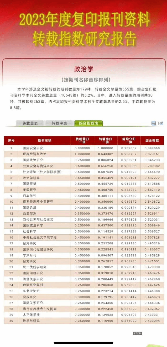 《国际论坛》入选2023年“复印报刊资料重要转载来源期刊”