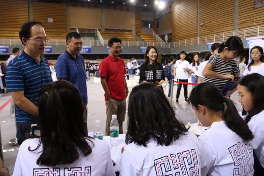 北京外国语大学校党委书记王定华视察迎新工作,并与迎新工作者们亲切交谈。