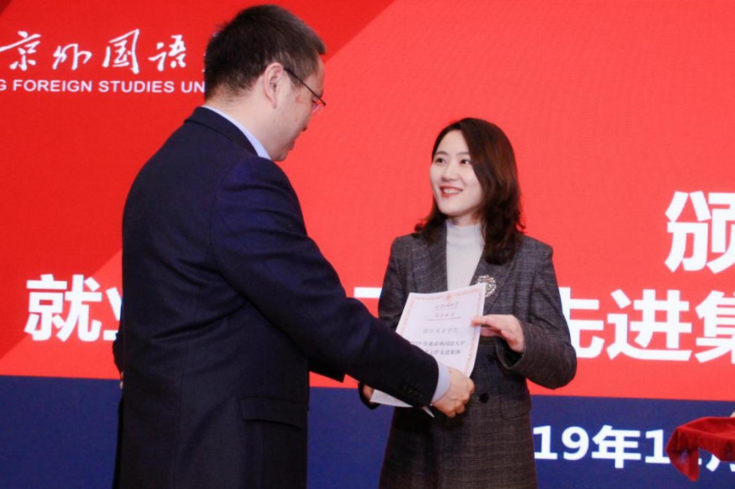 近日,pp电子模拟器官网荣获2019年北京外国语大学就业创业工作先进集体称号。12月25日召开的北外2019年就业创业工作大会上,北京外国语大学杨丹校长向学院代表,pp电子模拟器官网团总支书记、辅导员钱梦婷老师颁发荣誉证书。