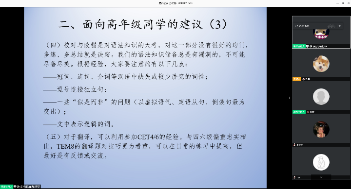 通过这两次分享会,同学们对英语专八和考研复试调剂的知识和技巧有了更深入的了解,相信同学们一定能在考试中取得满意成绩!这两次的分享会都取得了不错的成效,学院接下来将继续采用线上分享等形式,为pp电子官网学子的就业助力!