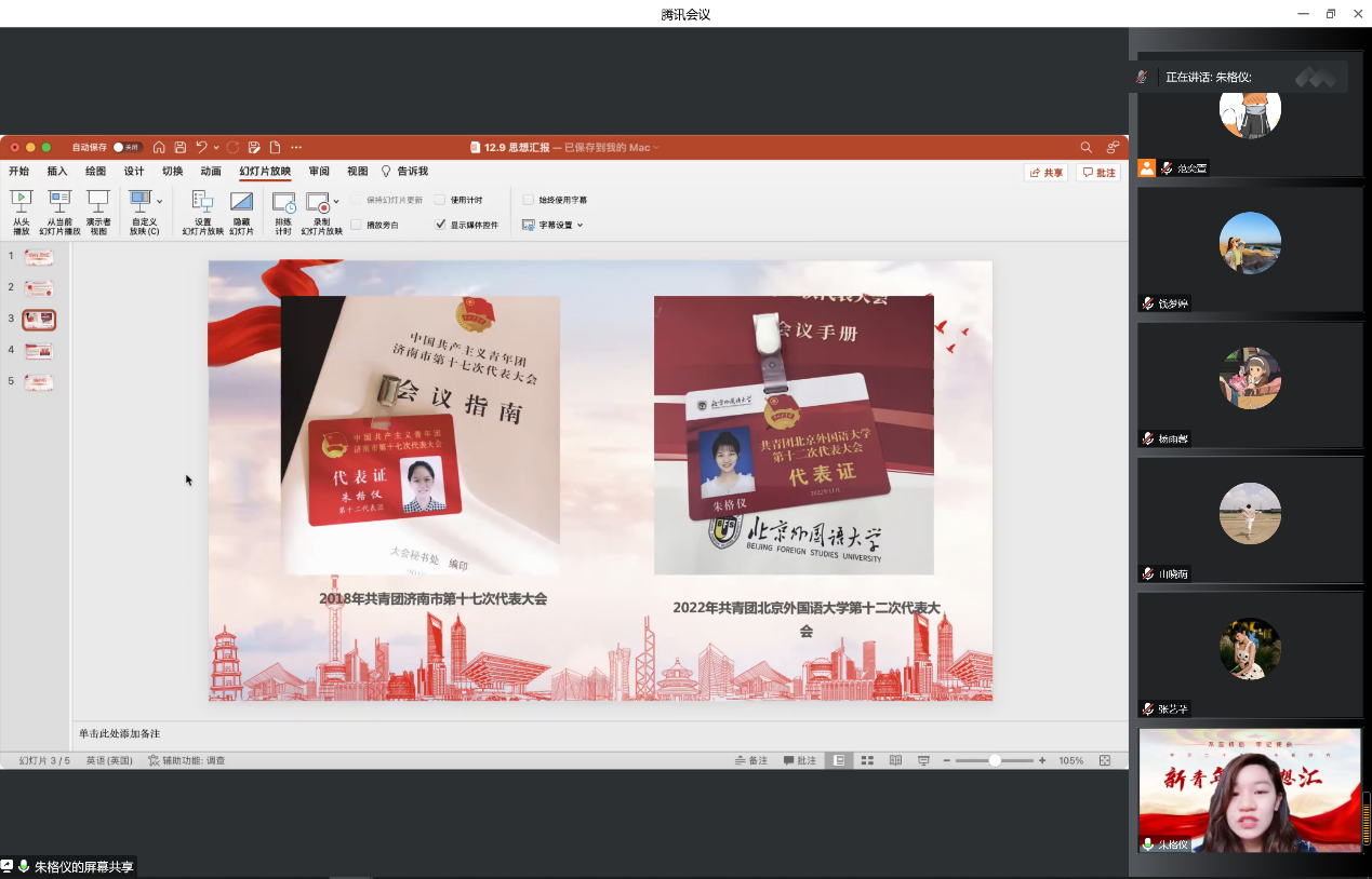 随后,在分享人发言环节,2020级王璟骊同学分享她在志愿者与社会实践部工作中的工作感受,深刻意识到北外人的工作身影在冬奥会、服贸会、社会实践立项方面做出的重要贡献,希望与北外青年一起继往开来,做新时代的新青年。2019级李正洁同学回顾五四运动的青年觉醒,立足当下疫情防控工作中青年的担当和国家航空强国战略的青年贡献,面向未来提醒中国青年的担当和使命,用实际行动实现中国梦。2022级杨雨馨同学结合青年实例和个人感想,用青年的思想向未来外国友人展示中国的思想。2021级山晓萌同学认为青年要知道我们从何处来到何处去,牢记当今时代的殷殷寄托,听党话、跟党走,有理想能担当,展望光明未来,打磨青春铁肩。2021级张艺芊同学,结合自己参与北外志愿活动的经历,发表自己有志气、有底气、有骨气的感悟。2020级朱格仪同学,回顾习总书记对青年的嘱托,结合自己两次参与团代会的经历和团学工作实践,讲述自己对于如何成为有理想的青年的认识。最后,2022级李昊洋同学,以习近平总书记的嘱托引入,用青年楷模秦玥飞、黄文秀为例,启示青年要通过学习不断磨炼自身品格。