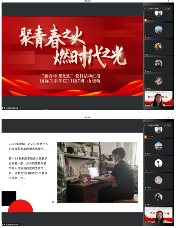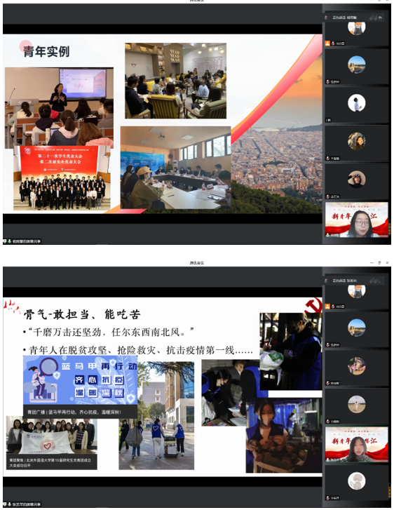 会议开始,pp电子模拟器官网本科生党支部书记钱梦婷老师从总书记对青年的工作的论述引入,讲解阐述青年与时代的关系、青年工作的地位、青年思想引领的主要任务和内容、青年工作的方法论等内容,回顾总书记对广大青年的殷切期盼和谆谆教诲。在抗击疫情、乡村振兴、志愿服务等国家大事中,钱老师对北外国关学子积极踊跃的参与给予高度的认可。