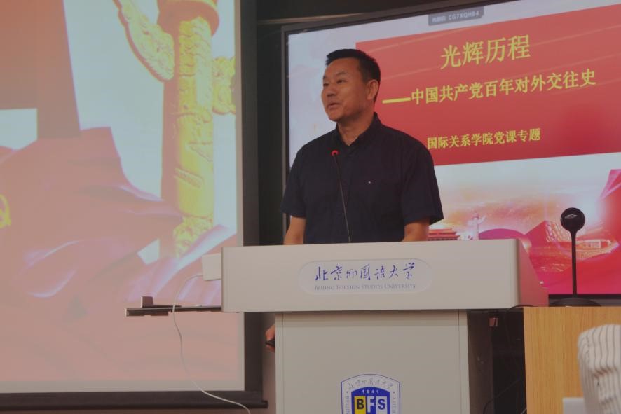 张效民书记将党史宣讲与外交专业知识相结合,为同学们讲述中国共产党发展的光辉历程以及北京外国语大学的红色渊源,面向外交学、国际组织与全球治理专业的学生,张老师向同学们专门介绍了中国共产党在国际交往中的相关概念,并讲授了政党外交的相关知识,以及学习共产党对外交往史的重要意义。